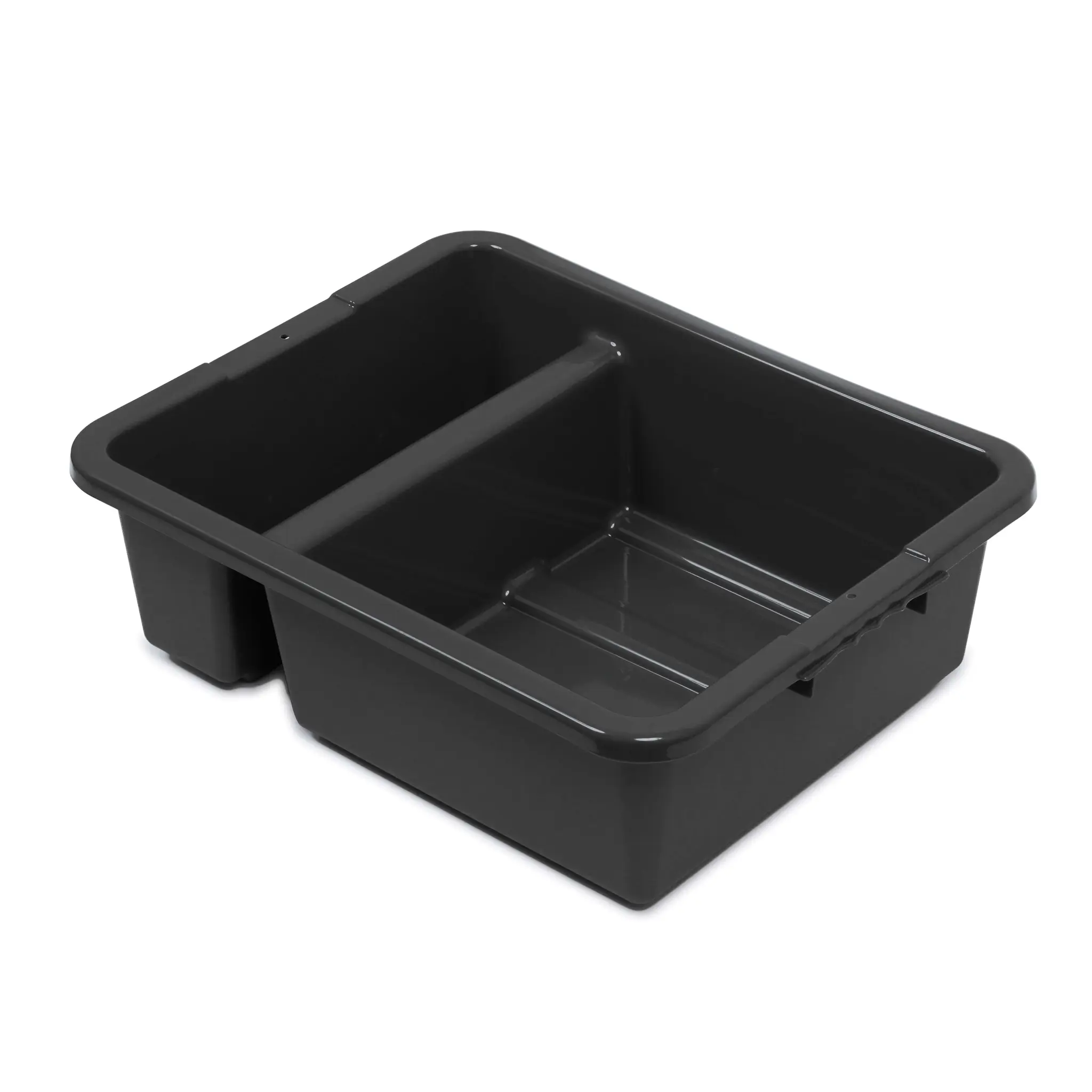 Improve dynamics with Royal Industries, DIN BTD10, Bus Box / Tub. This high-quality bus box is designed to enhance efficiency and organization in commercial restaurant settings. With its 2-compartment design and generous dimensions of 21-1/4"L x 17-1/4"W x 7" deep, it offers ample space for storing and transporting dishes, utensils, and other essentials. The ergonomic handles ensure comfortable handling, while the reinforced rims provide added durability. Made from scratch-resistant, high-density polyethylene, this bus box is built to withstand the demands of a busy kitchen. It is NSF 2 certified, guaranteeing its safety for food contact, and is also BPA-free. The black color adds a sleek and professional touch to any restaurant environment. Trust Royal Industries, a reputable vendor in the industry, to deliver a reliable and practical solution for your restaurant's needs.