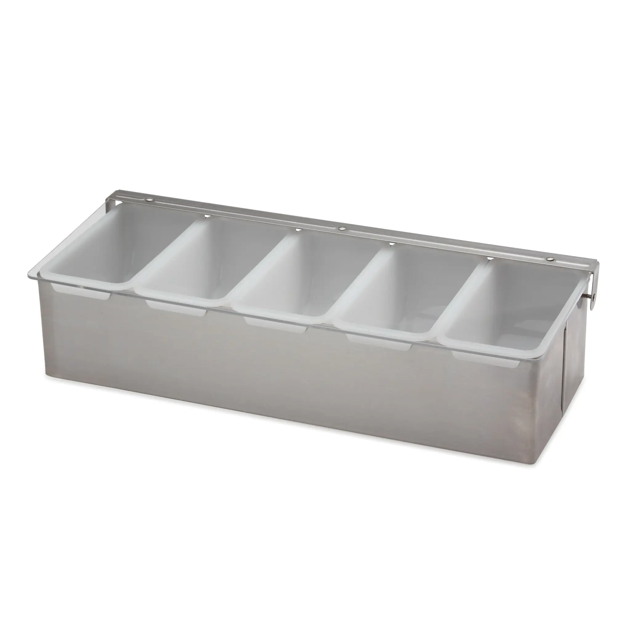 Improve operational flow with the Royal Industries, ROY CDS 5, Bar Condiment Holder. This stainless steel condiment dispenser is designed to enhance efficiency in commercial restaurant settings. With its 5 plastic pint inserts and hinged cover, it provides ample space for organizing and storing various condiments. The dispenser measures 3-1/2"H x 15"W x 6" deep, making it compact yet spacious enough to accommodate multiple condiment options. Its durable construction ensures long-lasting use, while the hinged cover keeps the condiments fresh and protected from contaminants. The Royal Industries, ROY CDS 5, Bar Condiment Holder is packed by Royal Industries and comes in a case with 1 unit. It is an essential tool for any bar or restaurant, allowing for easy access to condiments and improving overall operational efficiency. Upgrade your condiment organization with this reliable and practical dispenser.