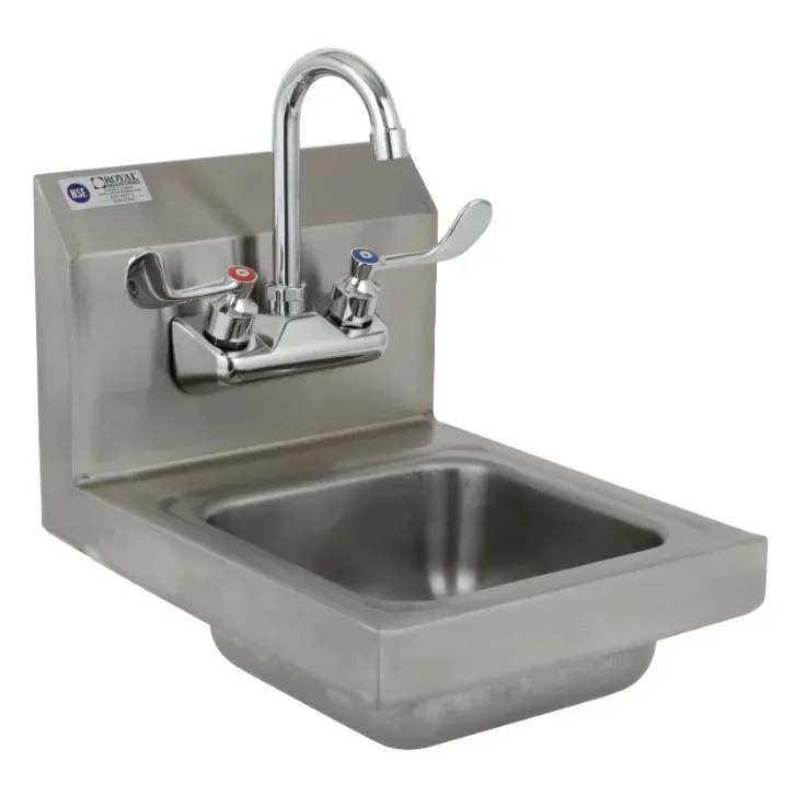 Facilitate smooth operations with the Royal Industries, ROY HSW 12, Hand Sink. This wall-mounted sink is designed specifically for commercial restaurant use, ensuring efficiency and convenience in your kitchen. The 9" x 9" x 5"D bowl size provides ample space for handwashing, while the 1-1/2" drain basket helps to prevent clogs. The standard duty 4" OC splash-mounted faucet, made of low lead stainless steel, features a gooseneck spout and wrist handles for easy use. The color-coded hot and cold indicators further enhance safety and efficiency. Made of 20 gauge T-304 stainless steel, this sink is durable and NSF certified for food safety. The sink also comes with a wall bracket for easy installation. Trust Royal Industries for high-quality, reliable restaurant equipment.