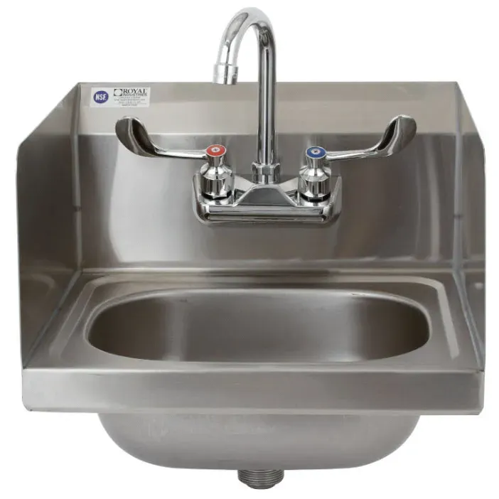 Optimize operational functionality with the Royal Industries, ROY HSW 15 SP Hand Sink. This wall-mounted sink is designed specifically for commercial restaurant use, ensuring efficiency and convenience in your kitchen. The 10" x 12-3/4" x 6"D bowl size provides ample space for handwashing, while the 8" backsplash and dual side splash protect your walls from water splashes. The sink comes with a standard duty 4" OC splash-mounted faucet, featuring a gooseneck spout and wrist blade handles for easy operation. The color-coded hot and cold indicators further enhance usability. Made of 20 gauge T-304 stainless steel, this sink is durable and NSF certified for safe food handling. The sink also includes a 1-1/2" drain basket and wall bracket for easy installation. Upgrade your restaurant's hygiene standards with this high-quality hand sink from Royal Industries.