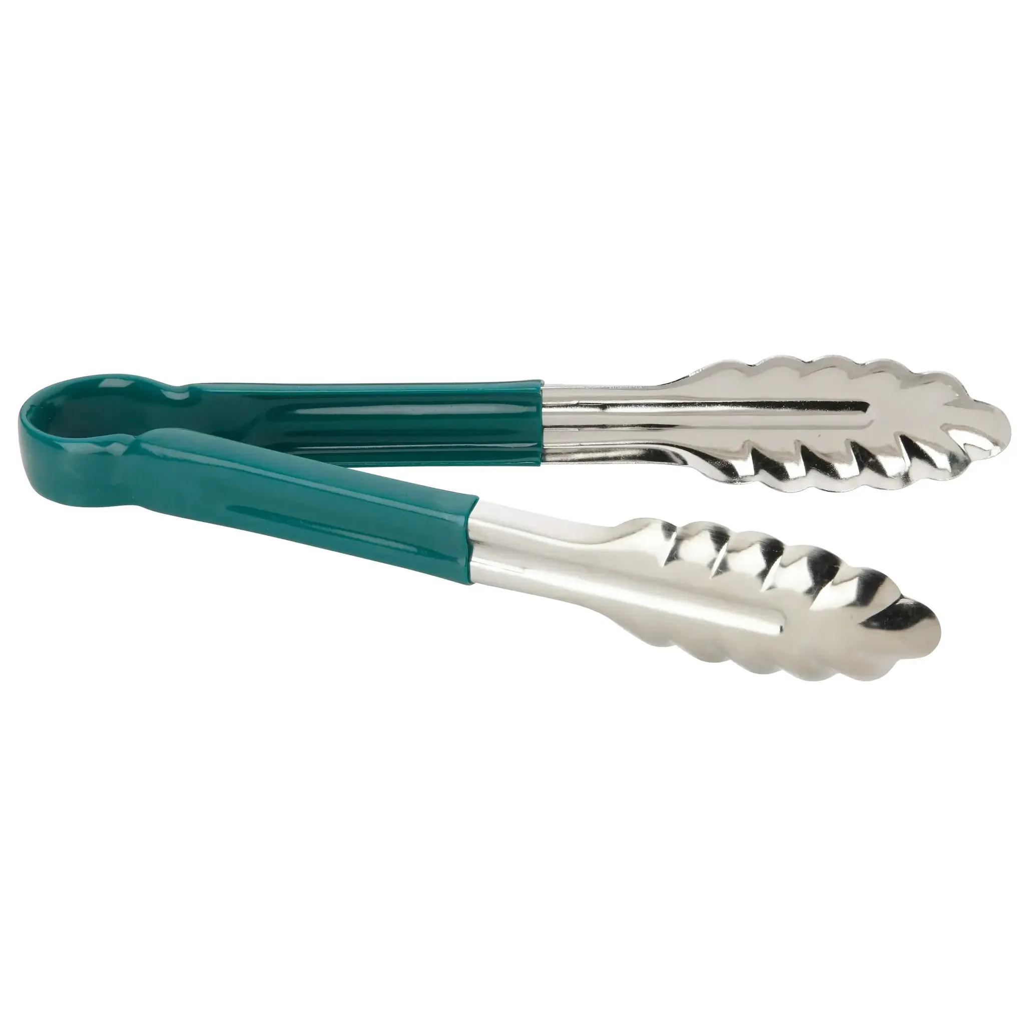 Optimize functionality with the Royal Industries, ROY TSC 9 G Utility Tongs. These 9-1/2" tongs are designed to enhance efficiency and convenience in a commercial restaurant setting. Made from durable stainless steel, these tongs are built to withstand the demands of a busy kitchen. The 1-piece construction ensures long-lasting performance, while the 7mm thickness provides a sturdy grip on food items. The tongs feature a color-coded green handle, allowing for easy identification and preventing cross-contamination. With their versatile design, these utility tongs are perfect for flipping, turning, and serving a variety of dishes. Whether you're grilling, sauteing, or plating, these tongs are a must-have tool. Additionally, these tongs comply with California's safety regulations, ensuring the health and well-being of your customers. Upgrade your restaurant's efficiency and safety with the Royal Industries, ROY TSC 9 G Utility Tongs.