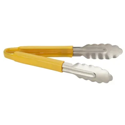 Optimize processes with the Royal Industries, ROY TSC 9 Y, Tongs, Utility. These 9-1/2" utility tongs are designed to enhance efficiency in commercial restaurant settings. Made of durable stainless steel, these tongs are built to withstand the demands of a busy kitchen. The 1-piece construction ensures long-lasting performance, while the 7mm thickness provides a sturdy grip on various food items. The yellow handle is color-coded for easy identification and helps prevent cross-contamination. With a case pack of 1, these tongs are a convenient addition to any restaurant's kitchen supplies. Not only do they streamline food preparation and serving processes, but they also prioritize safety. The tongs are compliant with California's safety regulations and are free from harmful chemicals like Bisphenol A (BPA). Upgrade your restaurant's operations with the Royal Industries Utility Tongs.