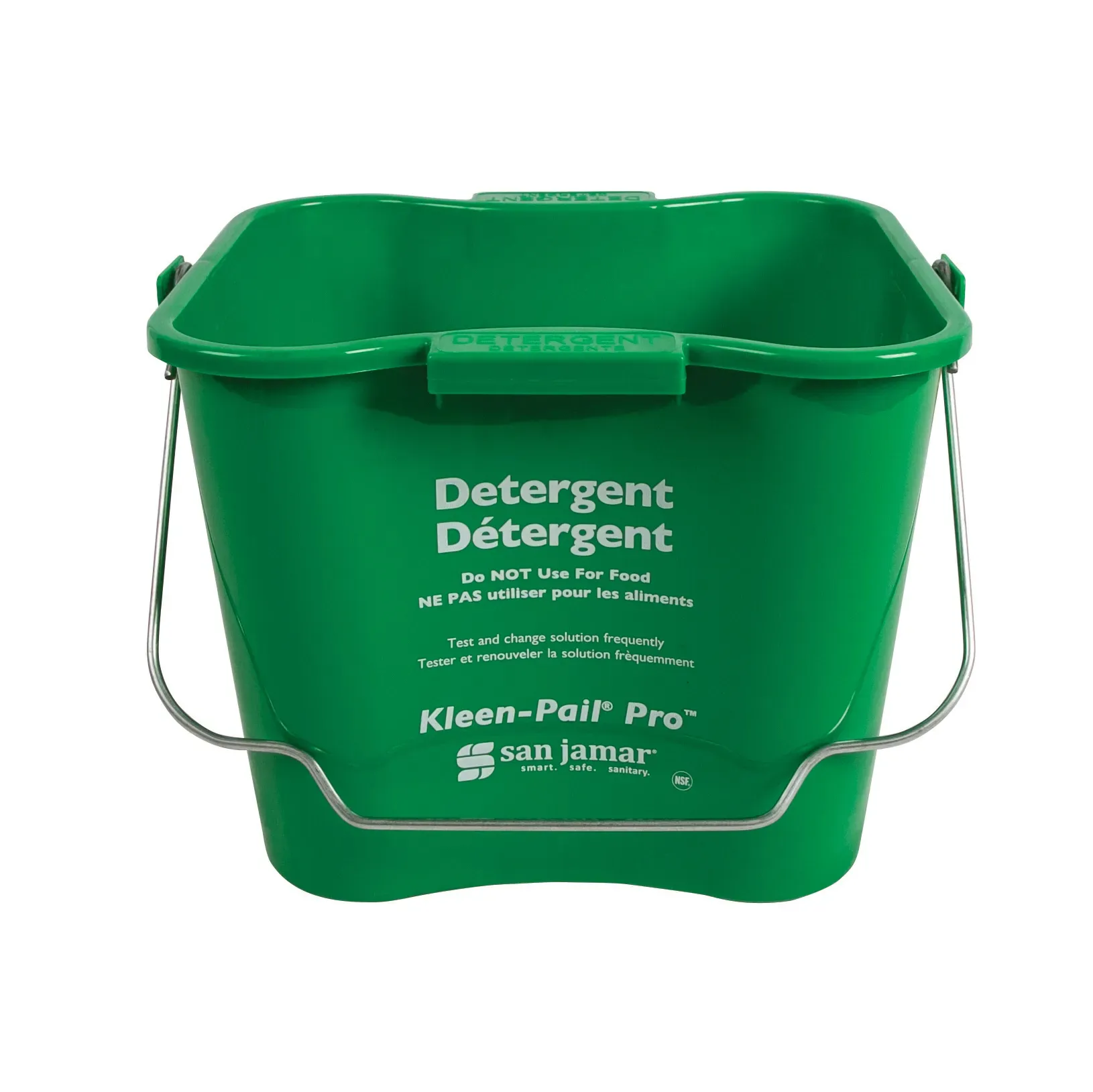 Maximize efficiency with the San Jamar KPP256GN Bucket. Designed for commercial restaurant use, this 8 qt. Kleen-Pail Pro is a must-have for any busy kitchen. Its rounded corners and molded-in handles make it easy to carry and pour, while the drop handle ensures convenient storage. The bucket features embossed lettering and graduated markings for accurate measuring, and debris catching ribs to keep the contents clean. The raised bottom prevents the bucket from touching the floor, maintaining hygiene standards. With a trilingual design and dishwasher-safe construction, this green bucket meets HACCP guidelines and NSF standards. Trust San Jamar, a reputable vendor in the industry, to provide you with a durable and reliable solution for all your restaurant needs.