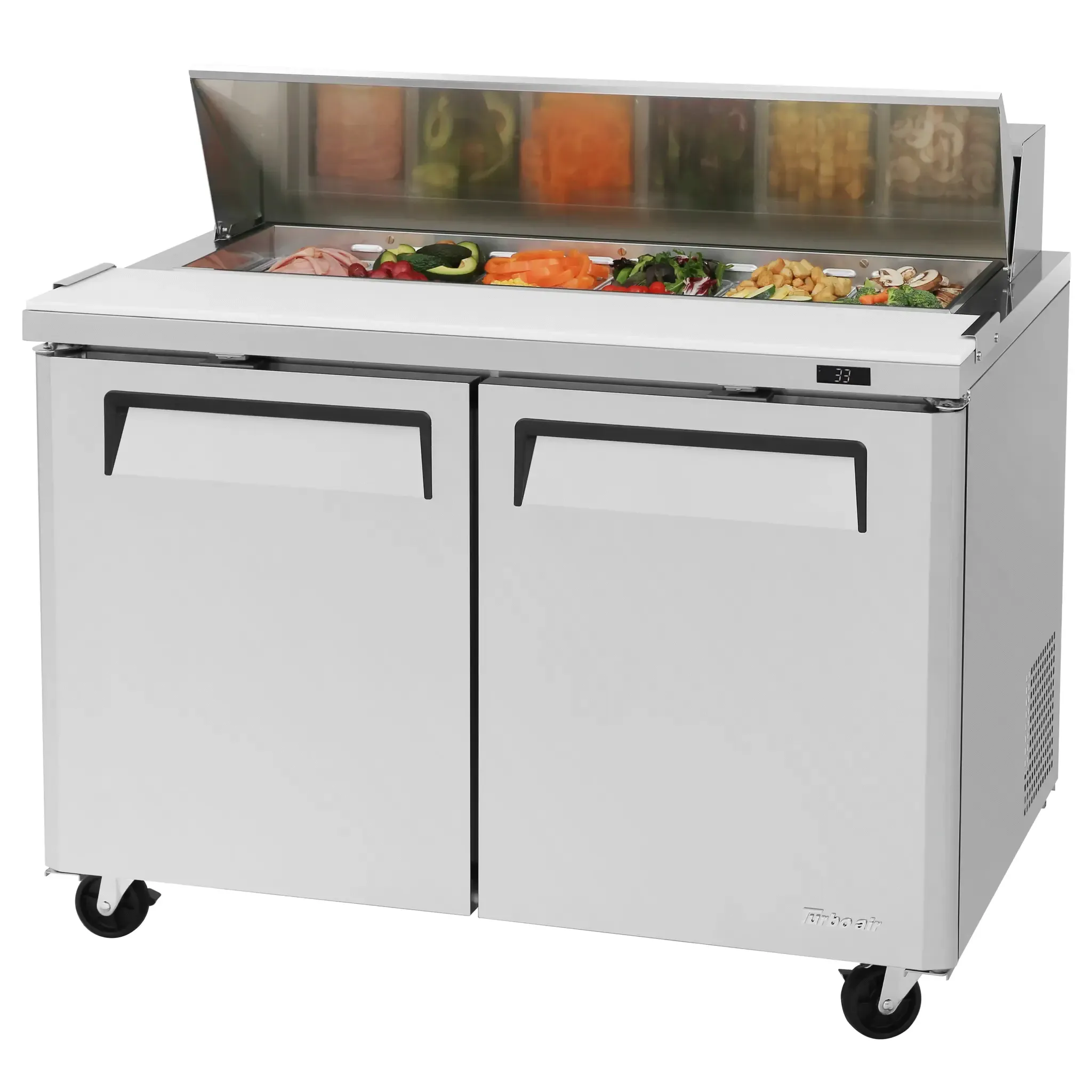 Realize kitchen dreams with the Turbo Air MST-48-N Refrigerated Counter, Sandwich / Salad Unit. This two-section unit is designed to meet the needs of commercial restaurants, offering a spacious 12.0 cu. ft. capacity and a 12-pan top opening with a convenient hood. The unit features two swing doors and two PE coated wire shelves for easy access and organization. With a 9-1/2" deep cutting board and side rail, preparing sandwiches and salads becomes a breeze. The digital temperature control ensures precise temperature management, while the self-cleaning condenser and cold bunker system keep the unit running efficiently. Made with stainless steel top, front, and sides, as well as an aluminum interior and stainless steel floor, this unit is built to withstand the demands of a busy kitchen. The LED interior lighting and fan control provide excellent visibility, and the R290 Hydrocarbon refrigerant ensures eco-friendly operation. Trust Turbo Air to deliver exceptional quality and performance for your restaurant needs.