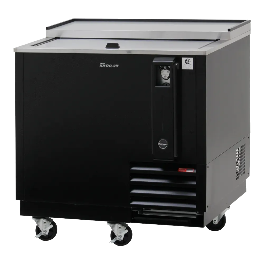 Cooking at its finest begins with the Turbo Air TBC-36SB-N6 Bottle Cooler. This sleek and efficient cooler is designed to meet the needs of commercial restaurants, ensuring that your beverages are always chilled and ready to serve. With a spacious 8.5 cu.ft. capacity and two PE coated adjustable dividers, you can easily organize and store a variety of bottles. The self-cleaning condenser equipped in this cooler ensures that it operates at peak performance, reducing the risk of breakdowns and extending the lifespan of the unit. The built-on removable bottle cap opener and catcher make it convenient for bartenders to quickly open and dispose of bottle caps. The sliding lid, stainless steel countertop, and lid add a touch of elegance to any bar setup. The black laminated exterior and stainless steel interior walls and floor not only provide durability but also make cleaning a breeze. The galvanized steel interior top and side mount compressor further enhance the longevity of the cooler. With front breathing and five casters, this cooler can be easily moved and positioned wherever it's needed. The Turbo Air TBC-36SB-N6 Bottle Cooler uses R600a Hydrocarbon refrigerant, which is not only environmentally friendly but also ensures efficient cooling. With a 1/8 HP compressor and 1.6 amps, this cooler is energy-efficient and cost-effective. The cord and NEMA 5-15P plug make installation a breeze. This cooler is cETLus and ETL-Sanitation certified, guaranteeing its safety and reliability. Upgrade your restaurant's beverage service with the Turbo Air TBC-36SB-N6 Bottle Cooler.