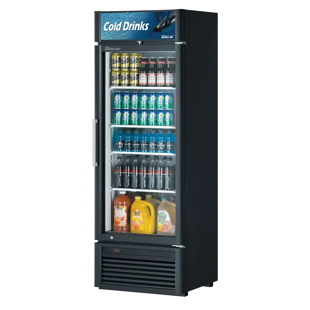 Enhance your commercial kitchen with the Turbo Air TGM-20SD-N6 Refrigerator Merchandiser. This super deluxe refrigerated merchandiser is perfect for showcasing your products while keeping them fresh and cool. With a spacious one-section design and 16.01 cu. ft. capacity, you'll have plenty of room to display a wide variety of items. The self-contained and self-cleaning condenser device ensures optimal performance and easy maintenance. The double pane Low-E hinged glass door with a lock provides both visibility and security. The adjustable PE coated wire shelves allow for flexible storage options. The exterior digital thermometer and controller, along with the door opening alarm, ensure precise temperature control and prevent spoilage. The self-diagnostic monitoring system and automatic fan motor delays detect malfunctions and provide early warnings. The Turbo cooling feature ensures quick and efficient cooling. The LED LGP sign panel and interior lighting beautifully illuminate your products. With its white interior and customizable exterior cabinet color, this merchandiser will seamlessly blend into your restaurant's aesthetic. The bottom mount compressor and R600a Hydrocarbon refrigerant ensure energy efficiency and environmental friendliness. Trust Turbo Air to deliver high-quality refrigeration solutions for your commercial kitchen.
