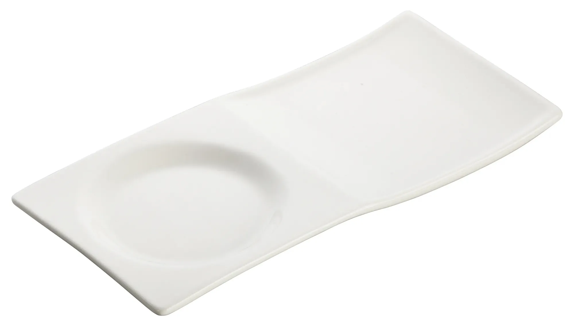 The tray features a unique rectangular shape with a single circular well, perfect for serving a variety of dishes with a touch of class. Whether you're presenting appetizers, desserts, or small entrees, this tray ensures your culinary creations are showcased beautifully. Its bright white finish provides a clean and modern look that complements any table setting, enhancing the overall dining experience for your guests.